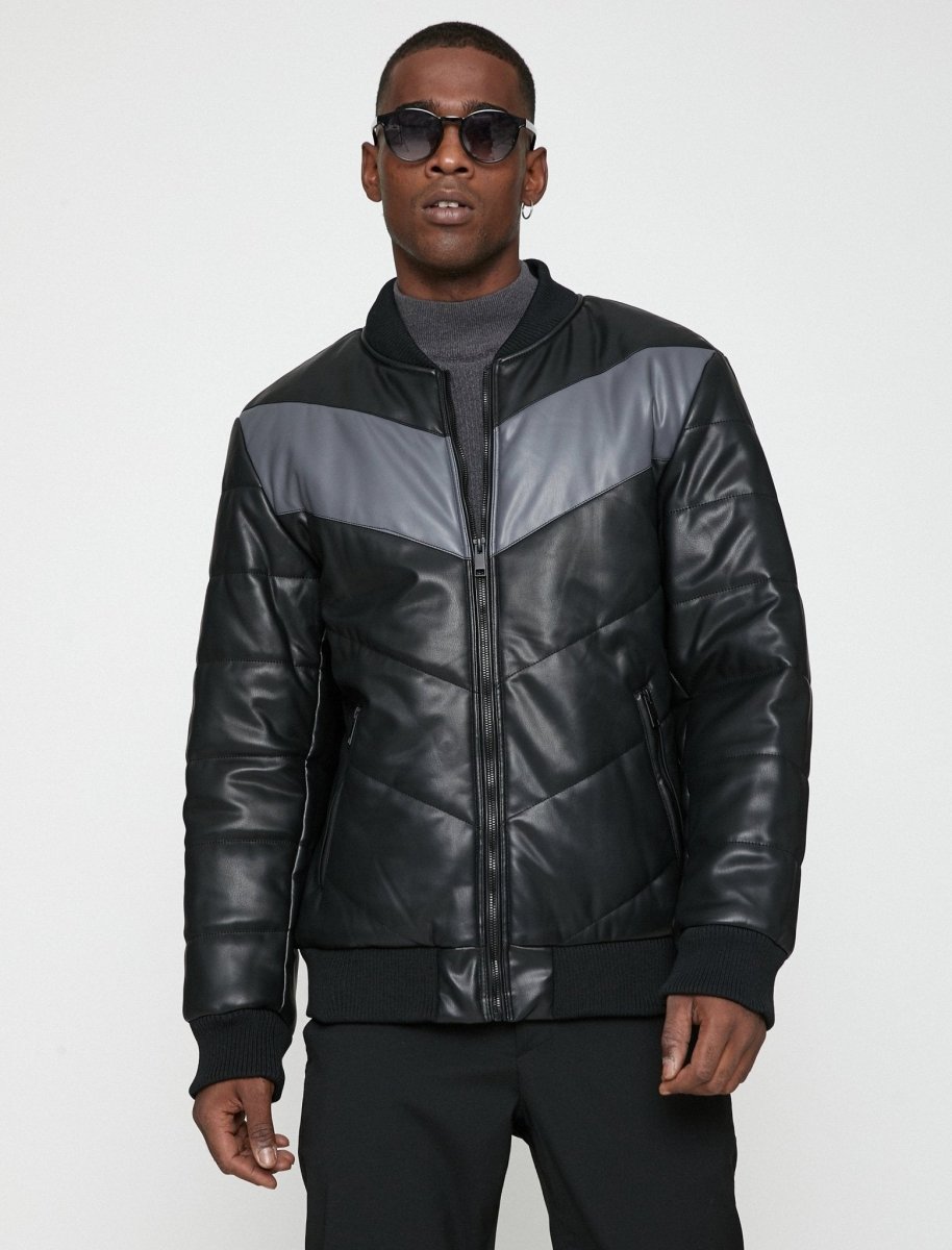 Presenting our new hybrid jacket by KOTON: It's quilted, it's vegan leather and it's a bomber. With its chevron pattern design of contrasting block panel, this quilted leather bomber jacket is the perfect mix of streetwear-style fashion and outdoor functionality. It features a ribbed collar, ribbed cuffs and hem. With its wide quilting, this mid-layer leather bomber jacket is ideal for layering over a mock neck sweater, not only for extra warmth but also so you can look your best in the hood.