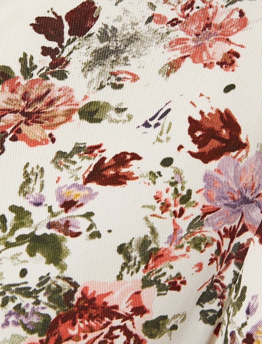 A warm and classy patterned button up, with frilly short sleeves and a V neck collar. Pairs perfectly with any set of jeans.