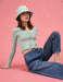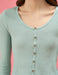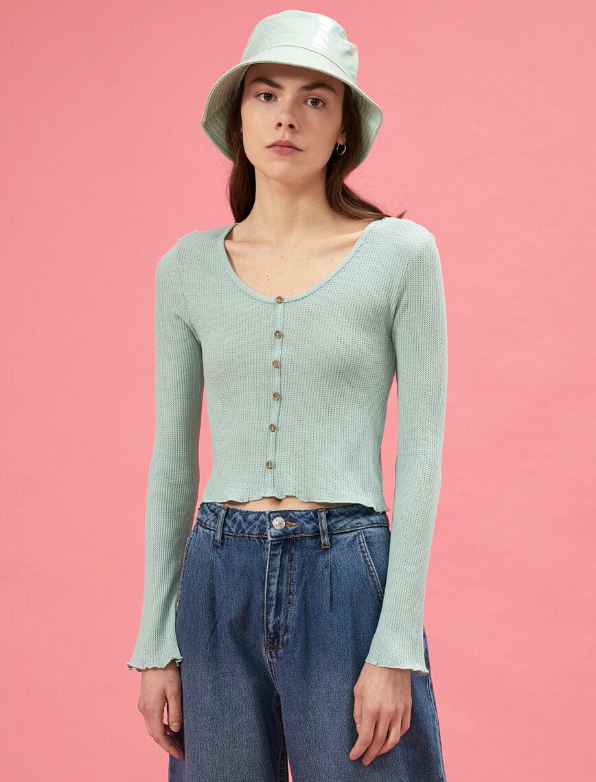 Fitted, ribbed stretch-knit. Cropped length (hits above the belly button). Fake Button-front closure . Scoop neck.