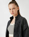 This denim bomber jacket with a straight-up collar has a boxy fit with a center front zipper opening, long sleeves with sleeve cuff, and body hem elastic detail. It has tonal seams and kangaroo packets.