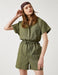 Utility-inspired, relaxed silhouette. Short rolled sleeves. Button-front collar. Tie-belt at waist.