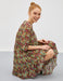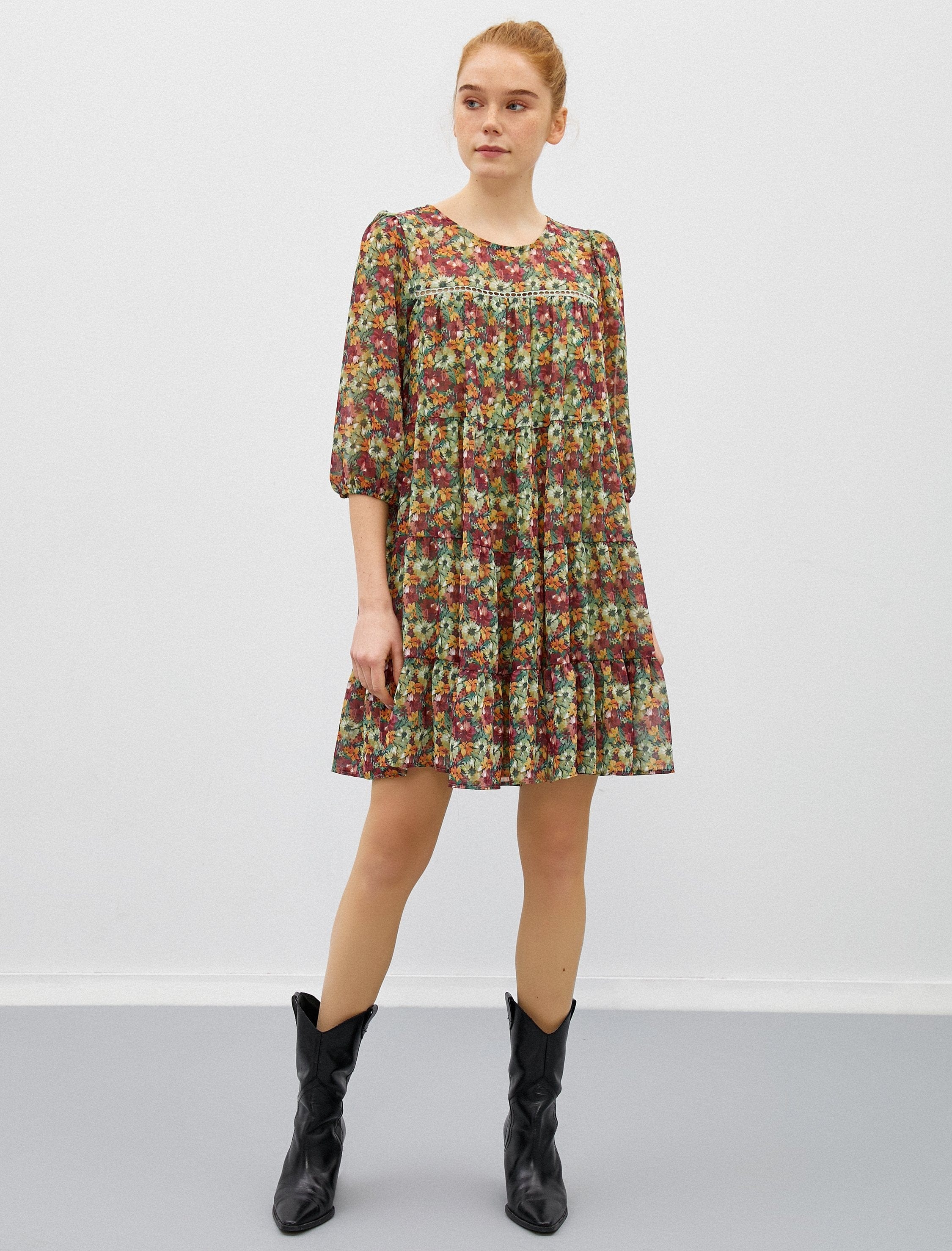 This Lightweight chiffon trapeze dress with allover floral print and draped ruffles will dress you in ultra feminine elegance