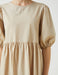 Round neckline, small opening at back of neck with covered button, and 1/2-length balloon sleeves with puff at shoulders and narrow elastic at cuffs. Unlined.