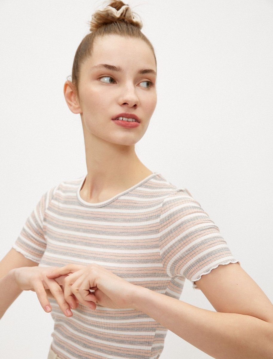Fitted, stretch ribbed knit. Short length. Crew neck. Short sleeves. Lettuce-edge detail