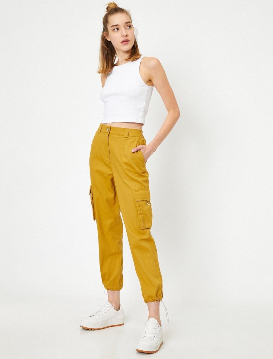 Elasticized waistband, side pockets, and leg pockets with flap. Tapered legs with elasticized hems. Normal-rise waist. Zip fly. Regular fit.