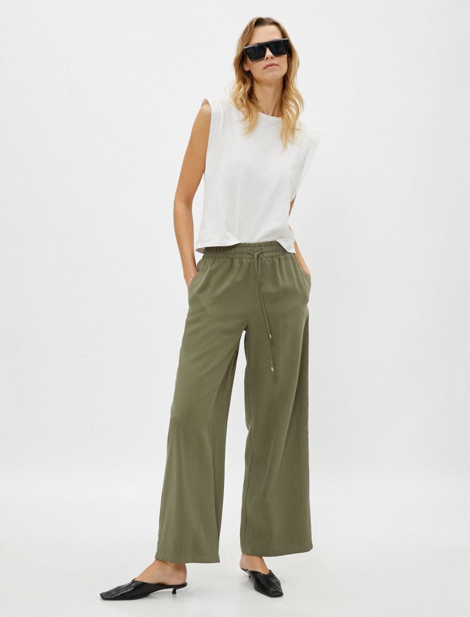 Full Elastic Waistband with drawstrings. Relaxed Flare Cut and Wide Legs. Side Pockets.