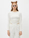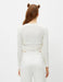 Fitted, stretch-knit. Cropped length. Long sleeves. Adjustable ruched front.