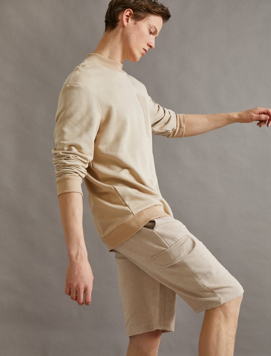 A heavy knit cargo jogger shorts topped with a comfortable pull-on elastic waistband with a drawstring.