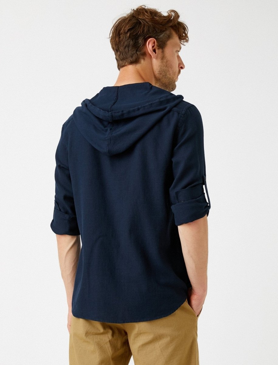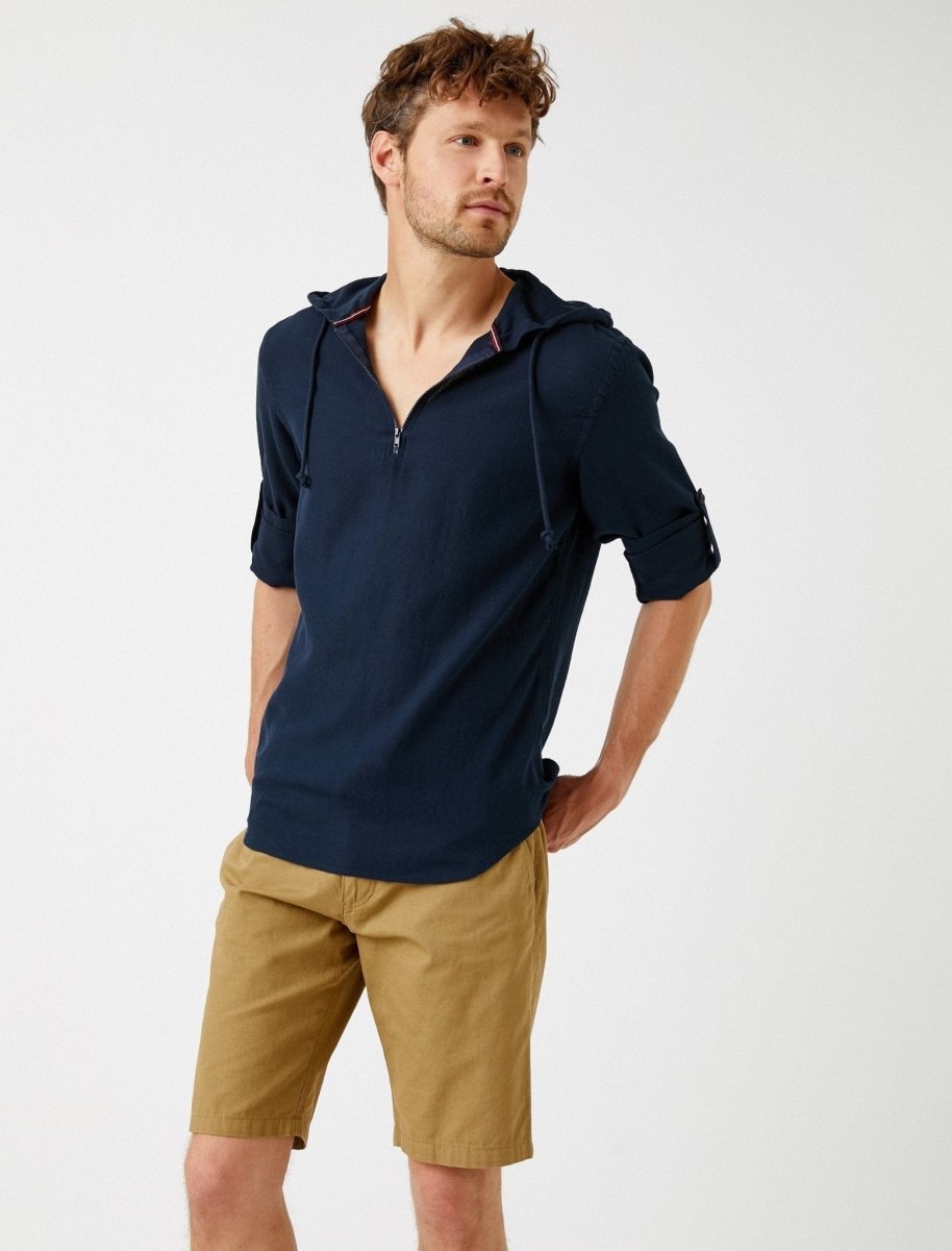 This shirt has a stylish hoodie attached that can also work as great protection from the sun. The garment features elastic drawstrings at the end of the sleeves so you can roll them up. A staple for your summer closet.