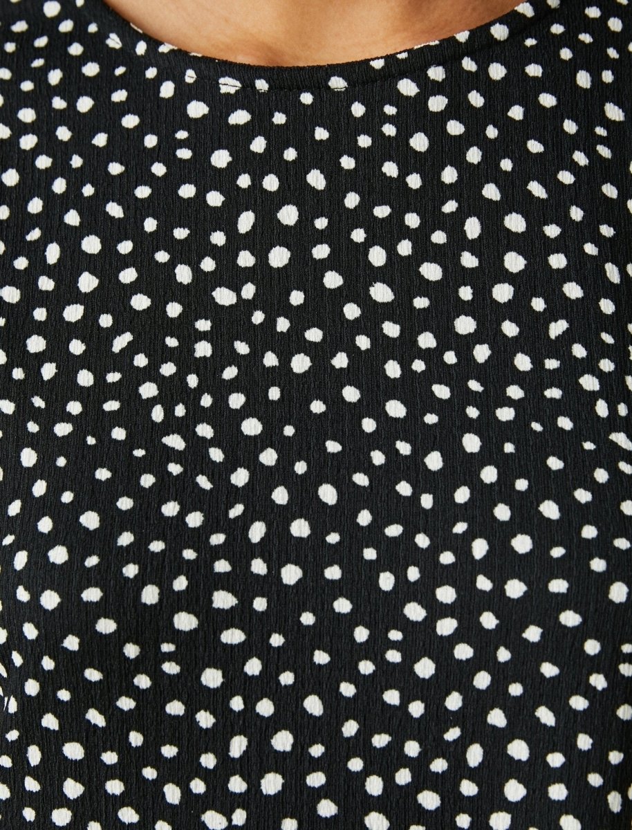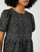 Dot print, round neck. Balloon sleeves. Tiered skirt. Regular fit, A shape.