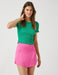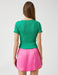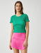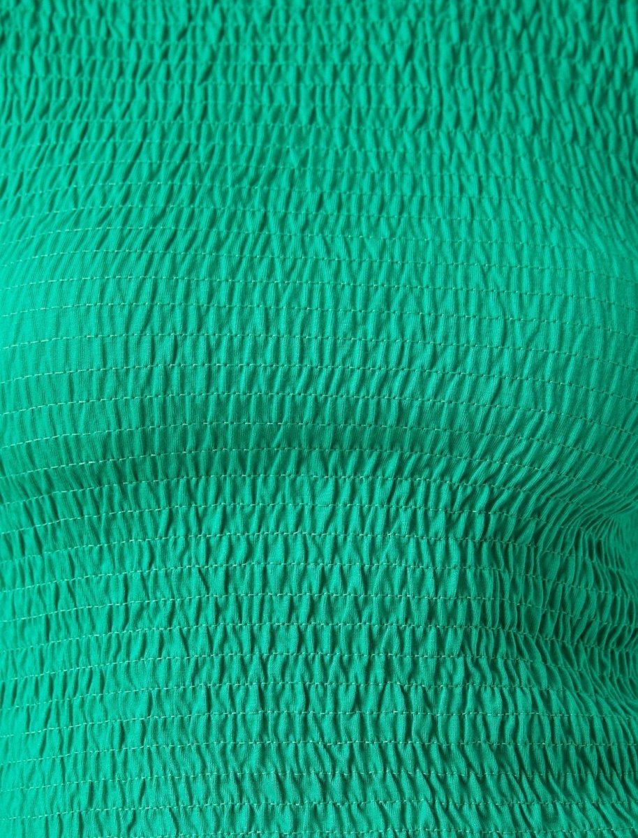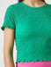 A knit top featuring a round neckline with ruffle trim, smocked bodice and short sleeves, and a form-fitting silhouette.